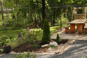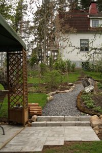 Piha on itäänpäin viettävässä rinteessä ja avoimen rinteen keskelle tehtiin alaspäin johtava sorakäytävä muutamine porrasaskelmineen.