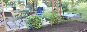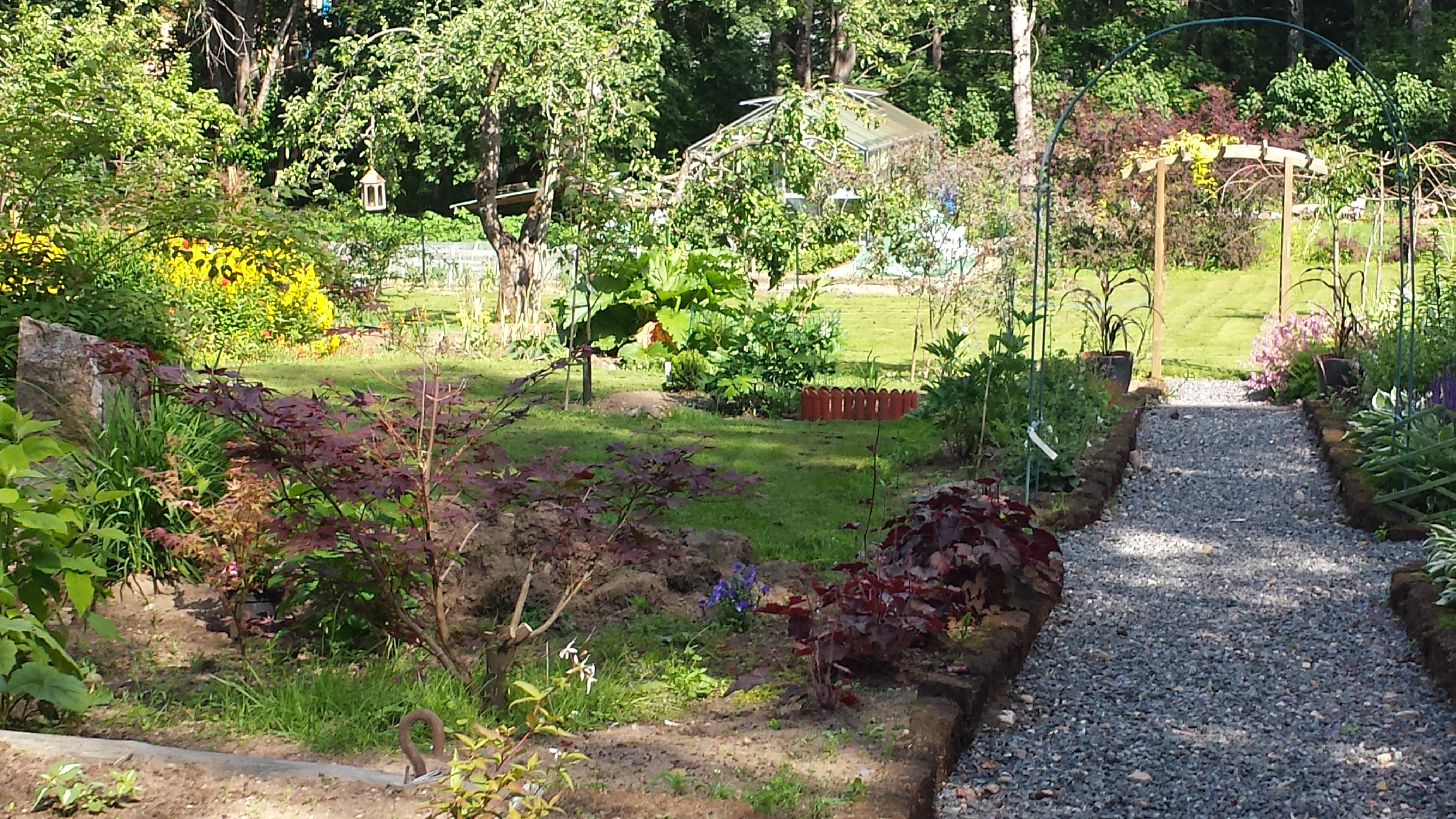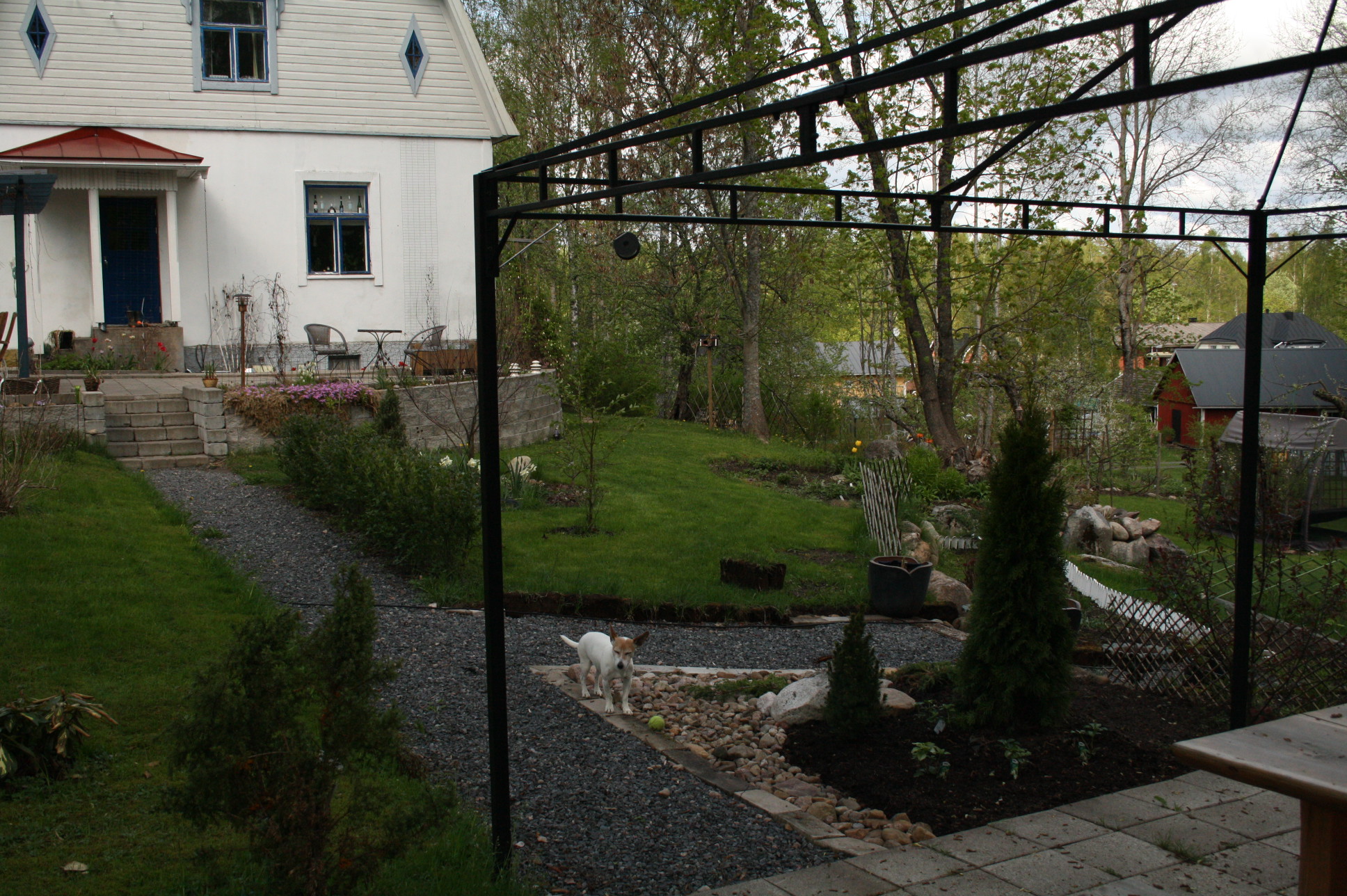 Etelän puolelta on vähennetty puita, mutta naapurin puolella kasvavat korkeat männyt varjostavat silti pihan eteläosaa, joka on siis kuvassa oikealla. Polun oikealle puolelle on jo istutettu melkoisesti kasveja, mutta vasemmalle puolelle tarvitaan näkemykseni mukaan valtavasti lisää. Puoleen väliin polkua on pystytetty kaari Maiden’s Blush-ruusulle ja muutama pionikin on ilmestynyt tähän keväällä ja keskikesällä varsin aurinkoiseen kohtaan. Köynnösruusu Maiden’s Blush oli viime kesänä toukkien vallassa. Kesti tovin ennen kuin huomasin, miksi ruusu ei kasvanut. Toukat söivät versot ja vielä kaivautuivat vielä päästä varren sisään. Poikkeuksellisesti jouduin käyttämään jopa kemiallista torjuntaa, eikä lopputuloksesta edelleenkään ole varmuutta.