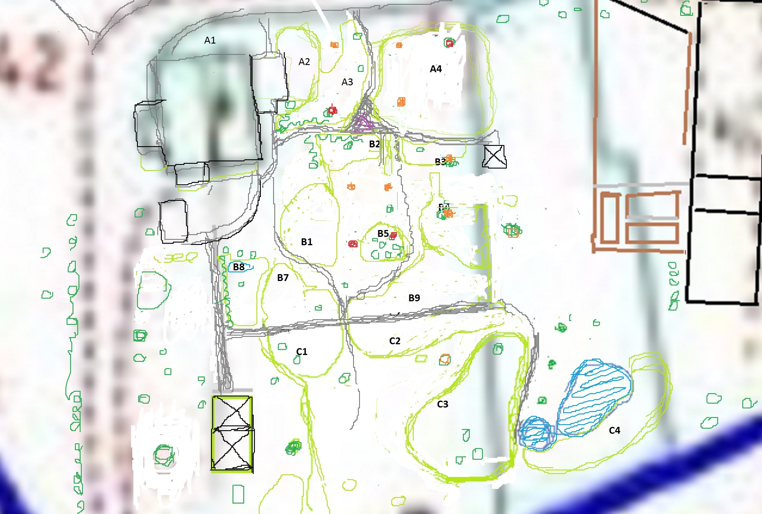 Olen laatinut puutarhasta summittaisen kartan, jonka numerointi viittaa kasviluetteloon. Tällä hetkellä lajeja on koristepuutarha-alueella nelisen sataa. Ruskealla rajattu alue on hyötypuutarha, sorakäytävät harmaita, lammet vaaleansiniset ja kukkapenkit vaaleanvihreät.