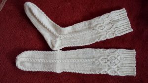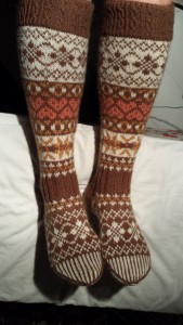 Ruskeat polvisukat on neulottu Novita Nallesta. Sydämet on Debbie Bliss-lankaa. Resoriksi valitsin Aran-palmikon. Kuviot ovat perinteisiä karjalaisia ja Fair Isle -malleja.