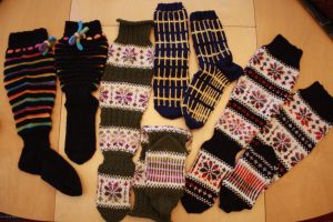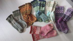 Vuoden 2016 suosikkimalli oli Ranskalaiset torisukat Ann Buddin Sukkakirjasta. Pientä omaa sovellusta ja erilaisia väriyhdistelmiä. Alla vuoden 2015 joululahjavalikoimaa. Näissäkin kokonaan omia malleja ja muunneltuja lainamalleja.